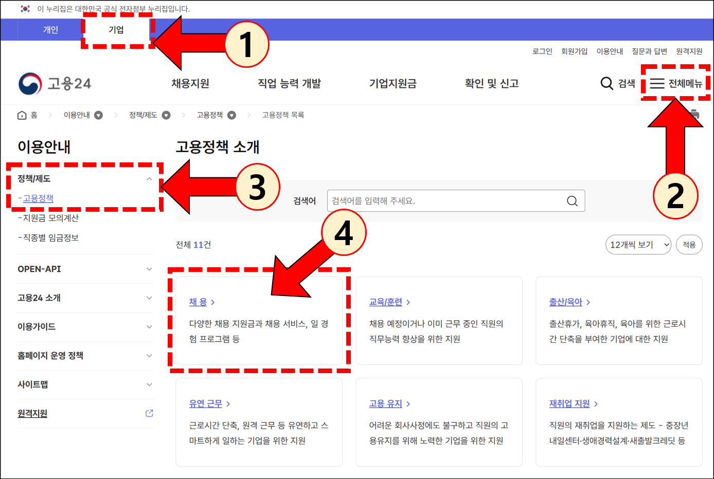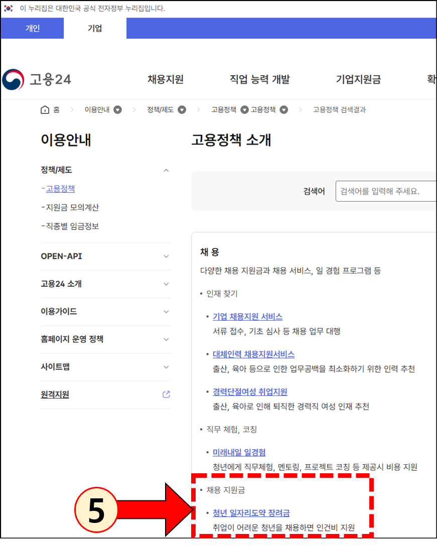 - [고용24] - [기업] - [전체메뉴] - [고용정책] - [채용] - [청년일자리도약장려금]